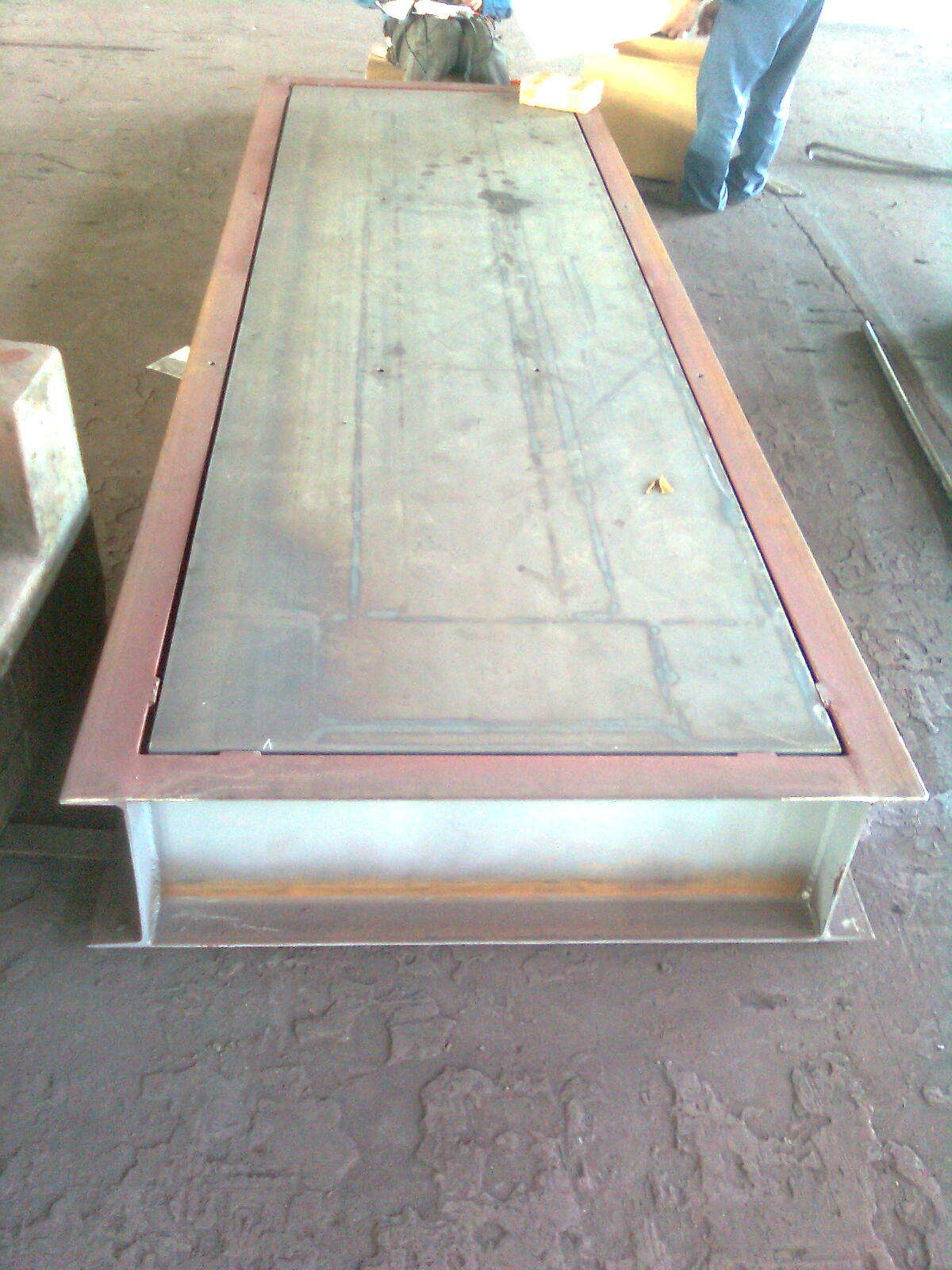 產品具有非常優異的耐腐蝕性能,創新的油漆工藝、環保的思路,使秤體的防腐性能達到了船用標準。板材加工前軋平,然后進行表面整體拋丸,清理等級達到國際通用的Sa2.5級,再進行初噴底漆預處理,運至機加工現場,通過大型折彎機折成U型鋼,上平臺進行組焊,秤體組焊完成后,再進行防銹防腐噴涂處理。 面板拼接采用全自動焊接,焊縫飽滿、光滑平整、美觀,立縫等采用CO2氣體保護焊,焊接工藝及達到的性能符合國家標準。